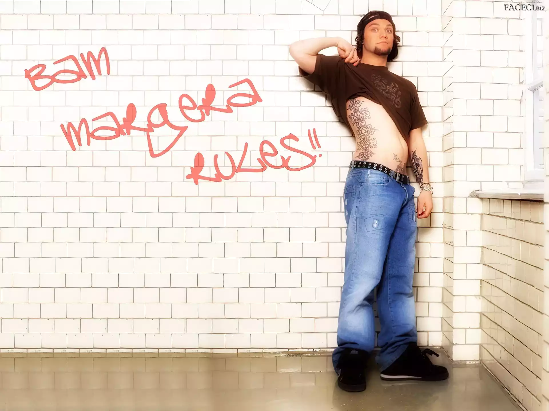 t-shirt, Bam Margera, brązowy kurtka, Bam Margera, rozpięta okulary, Bam Margera, butelka włosy, Bam Margera, ciemne okulary, Bam Margera, twarze zegarek, Bam Margera, deskorolka